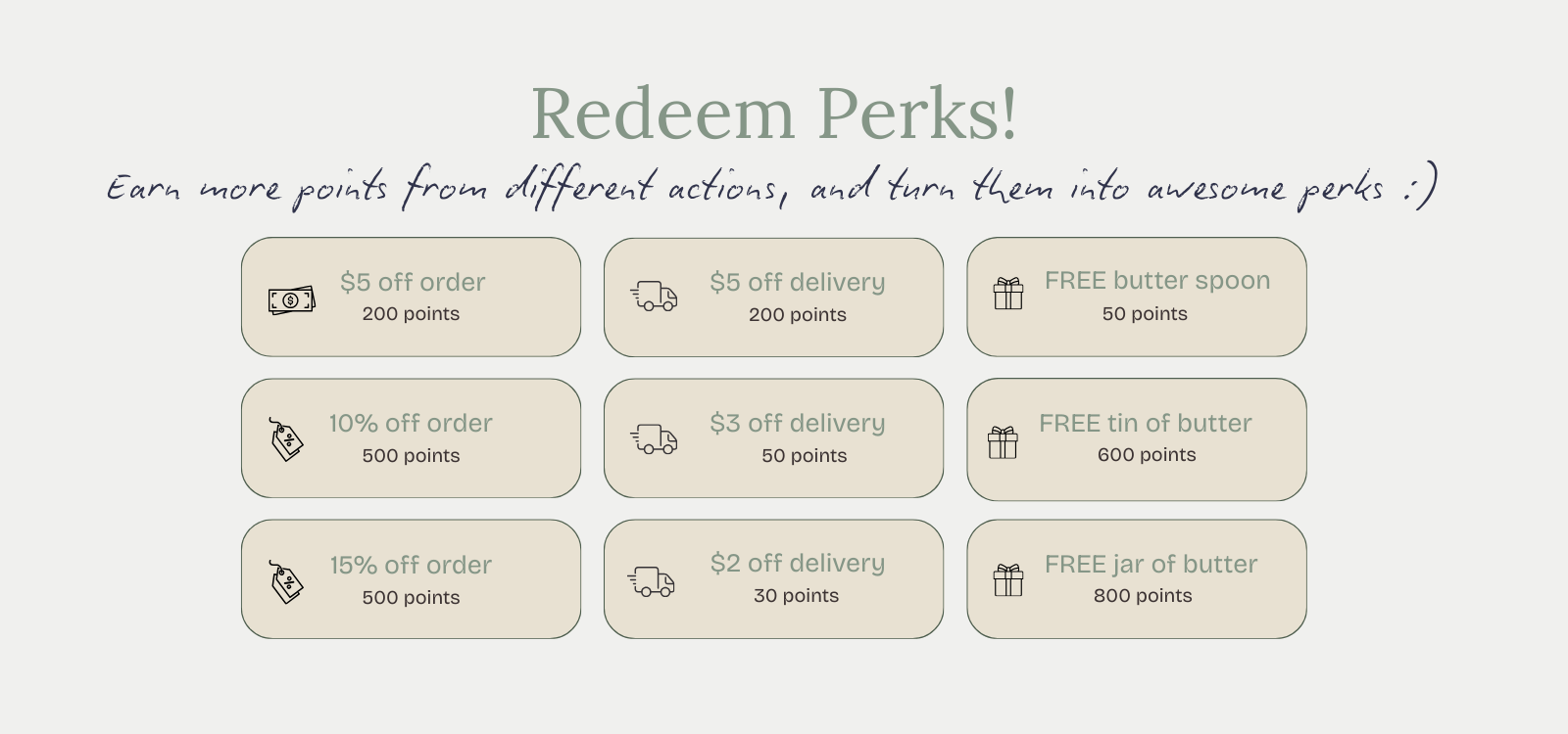 Points may be redeemed for rewards listed in The Butter Club Rewards Catalog, which may change from time to time. Some rewards may be limited to certain tiers; unlock them as you progress through the tiers!